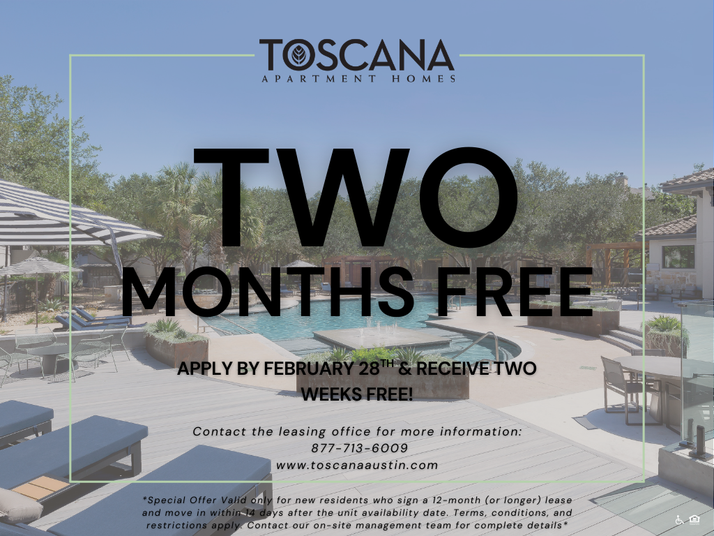 *Special Offer Valid only for new residents who sign a 12-month (or longer) lease and move in within 14 days after the unit availability date. Terms, conditions, and restrictions apply. Contact our on-site management team for complete details* *Oferta especial válida solo para nuevos residentes que firmen un contrato de arrendamiento de 12 meses (o más) y se muden dentro de los 14 días posteriores a la fecha de disponibilidad del apartamento. Se aplican términos, condiciones y restricciones. Comuníquese con nuestro equipo de administración en el lugar para obtener todos los detalles.*